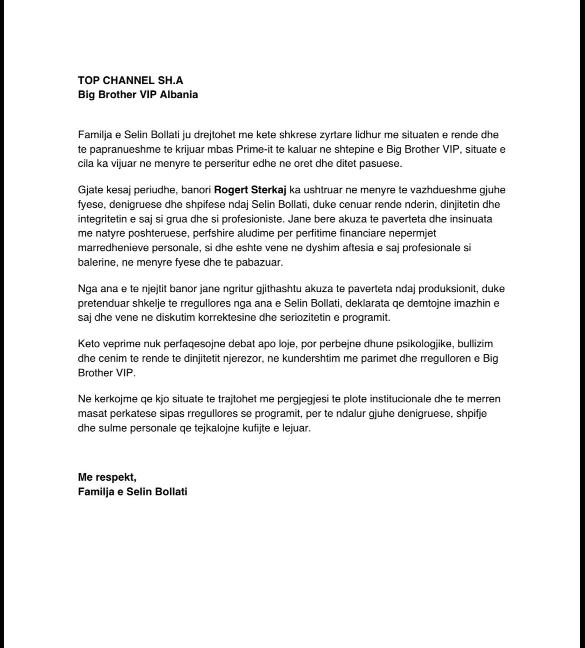 Familja e Selin Bollatit i është drejtuar zyrtarisht Top Channel dhe produksionit të Big Brother VIP Albania, duke shprehur shqetësimin e tyre të thellë për situatën e krijuar pas Prime-it të fundit në shtëpinë e BBVIP.