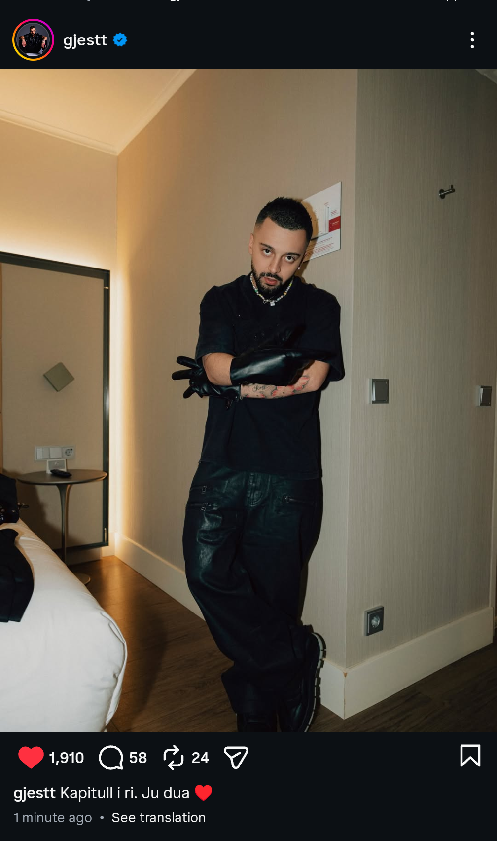 Në mes të këtij suksesi, Gjesti ka publikuar një foto të re në Instagram, ku shfaqet me një stil të veçantë (me dorashka lëkure dhe veshje të zezë). Por ajo që ka marrë më shumë vëmendje është mbishkrimi i fotos: