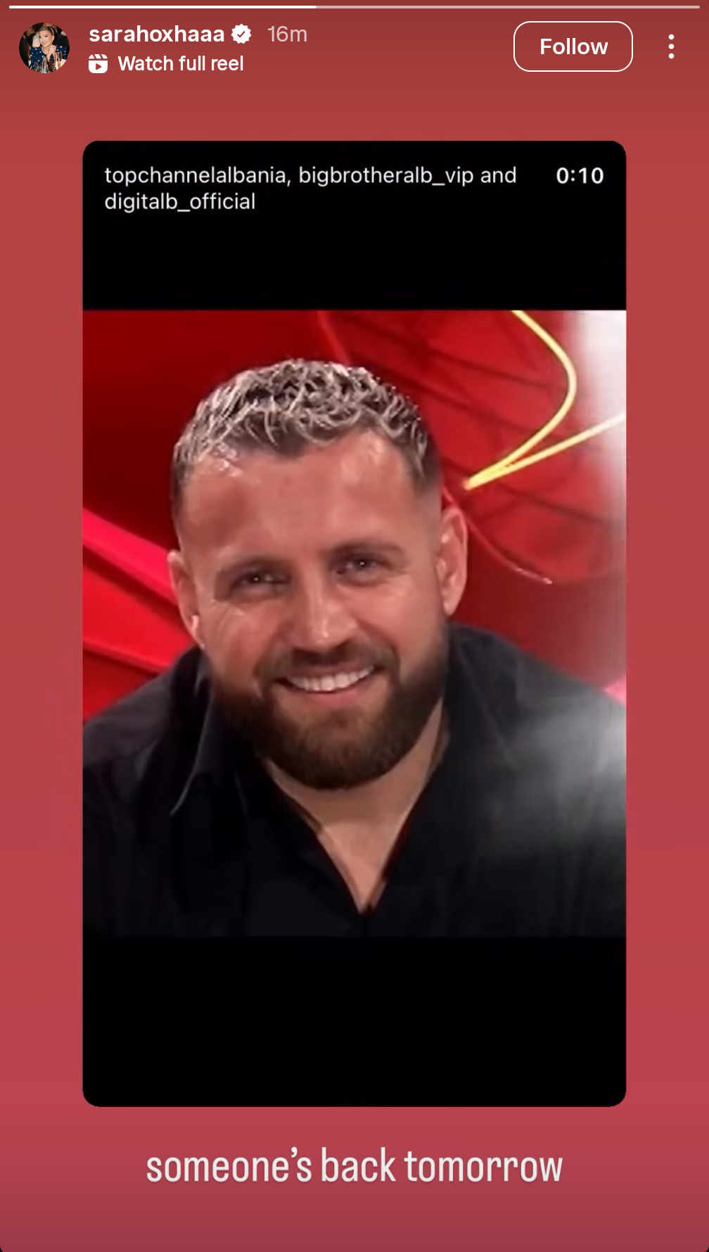 Nga ana tjetër, Sara Hoxha ka qenë ajo që ka zbuluar detajin kohor. Përmes një postimi në Instastory, ajo ka rishpërndarë videon virale duke e shoqëruar me diçiturën në anglisht: “Someone’s back tomorrow” (Dikush rikthehet nesër).