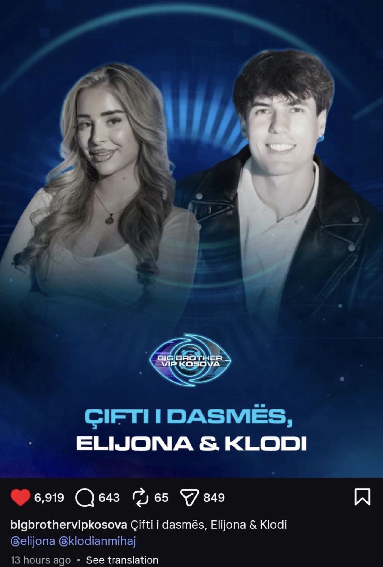 Për këtë sezon, produksioni ka zgjedhur Elijonën dhe Klodin si çiftin e ceremonisë simbolike.