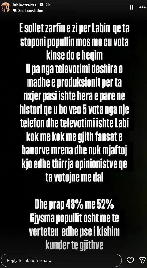 “E sollët zarfin e zi për Labin që ta stoponi popullin… U pa dëshira e madhe e produksionit për ta nxjerrë, pasi ishte hera e parë në histori që u bënë vetëm 5 vota nga një telefon,” – shkruan ai, duke shtuar se pavarësisht thirrjeve të opinionistëve kundër tij, rezultati ishte “kokë më kokë”, me një diferencë minimale 48% me 52%.