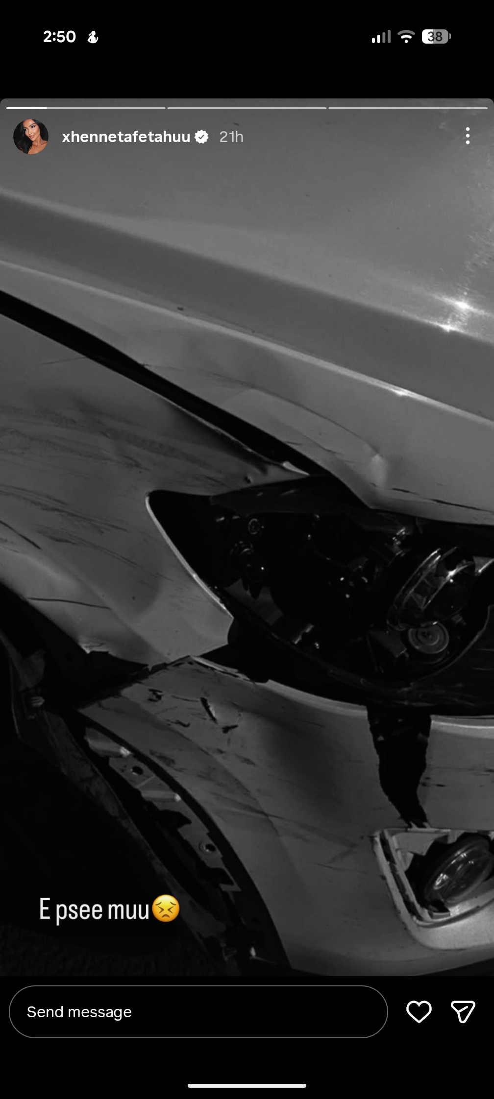 Xheneta ka publikuar një foto ku shihet pjesa e përparme e makinës së saj e dëmtuar nga përplasja, ndërsa sipër saj ka shkruar me dëshpërim: “E psee muu 😣”.