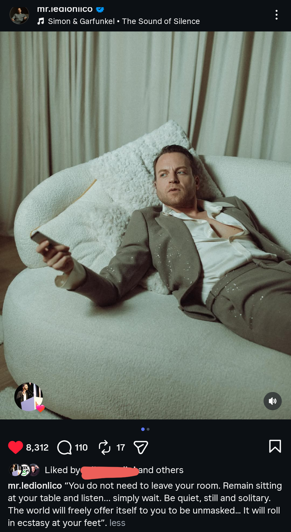 “Nuk ke nevojë të dalësh nga dhoma jote. Qëndro ulur në tryezën tënde dhe dëgjo… thjesht prit. Bëhu i qetë, i palëvizshëm dhe i vetmuar. Bota do të të ofrohet lirisht për t’u demaskuar… Do të rrokulliset në ekstazë në këmbët e tua,” – shkruhet në mbishkrimin e postimit të tij.