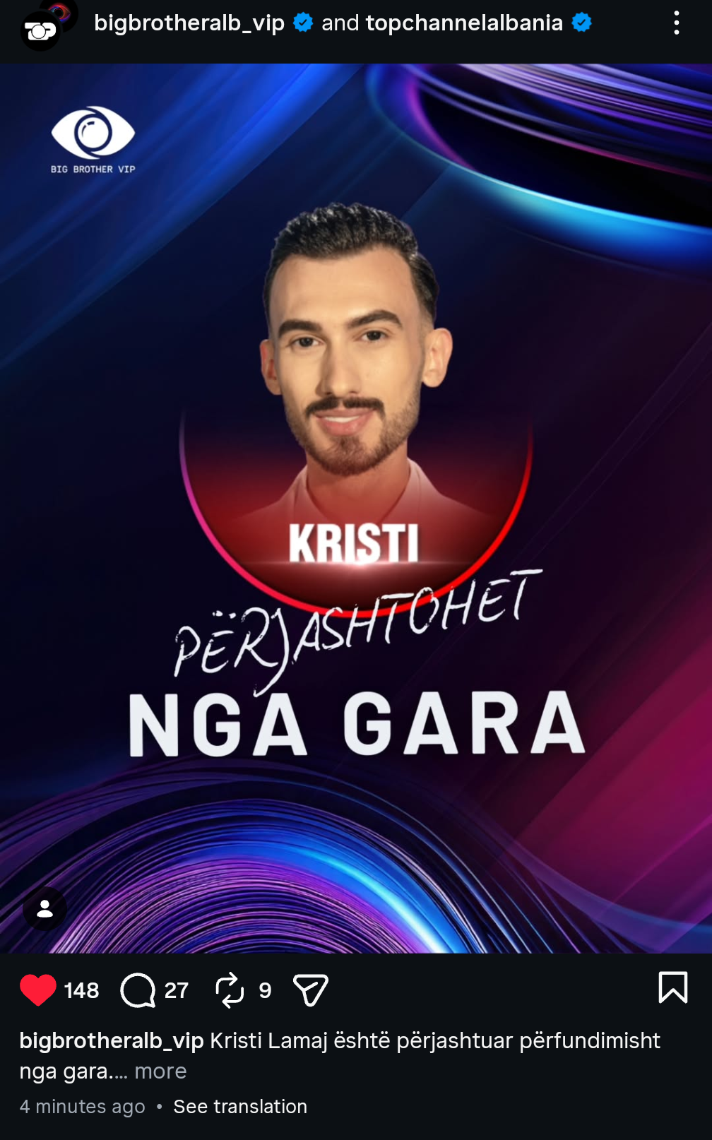 Përmes një njoftimi të befasishëm në faqet zyrtare të spektaklit në Instagram, “Big Brother Alb VIP” dhe “Top Channel”, është bërë e ditur se banori që është përjashtuar përfundimisht nga gara është Kristi Lamaj.