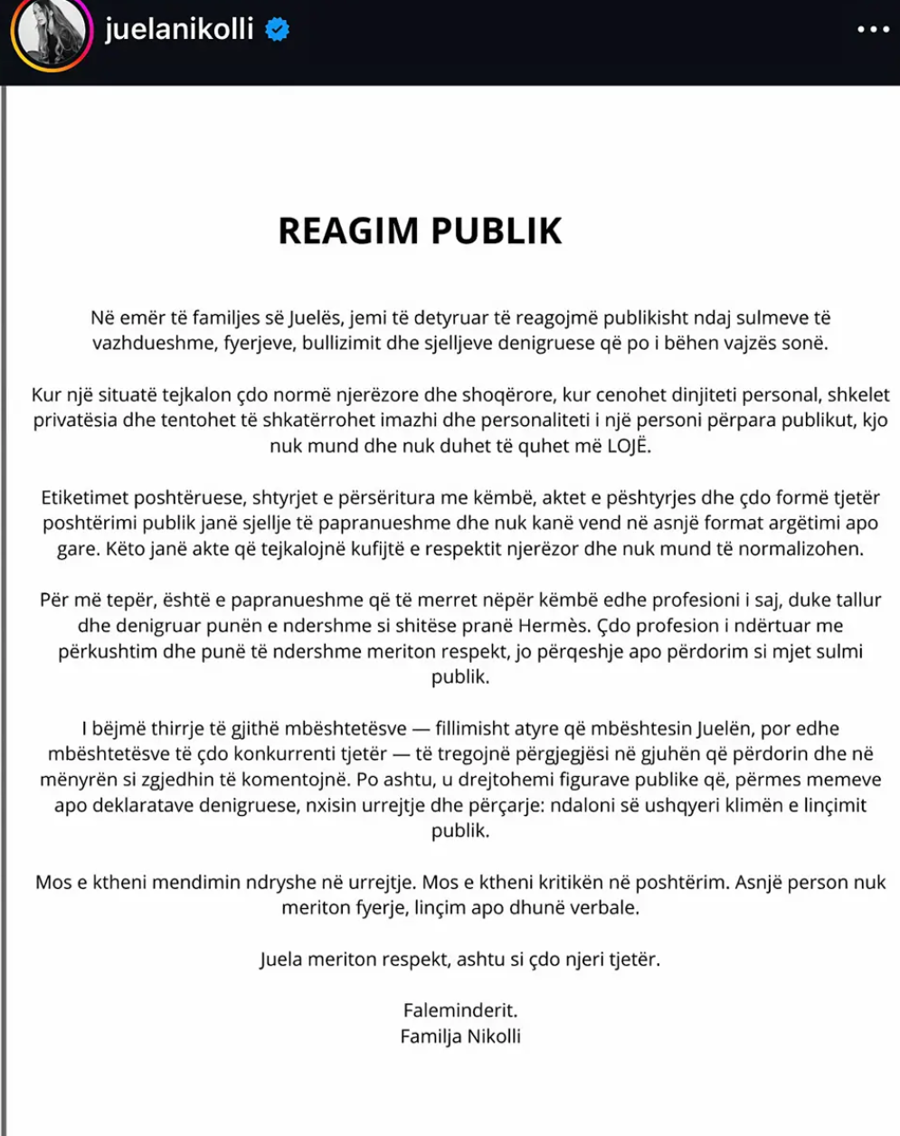 Familja e Juelës (Familja Nikolli) ka thyer heshtjen përmes një deklarate zyrtare, duke dënuar ashpër bullizmin dhe sjelljet denigruese që po rëndojnë mbi vajzën e tyre.