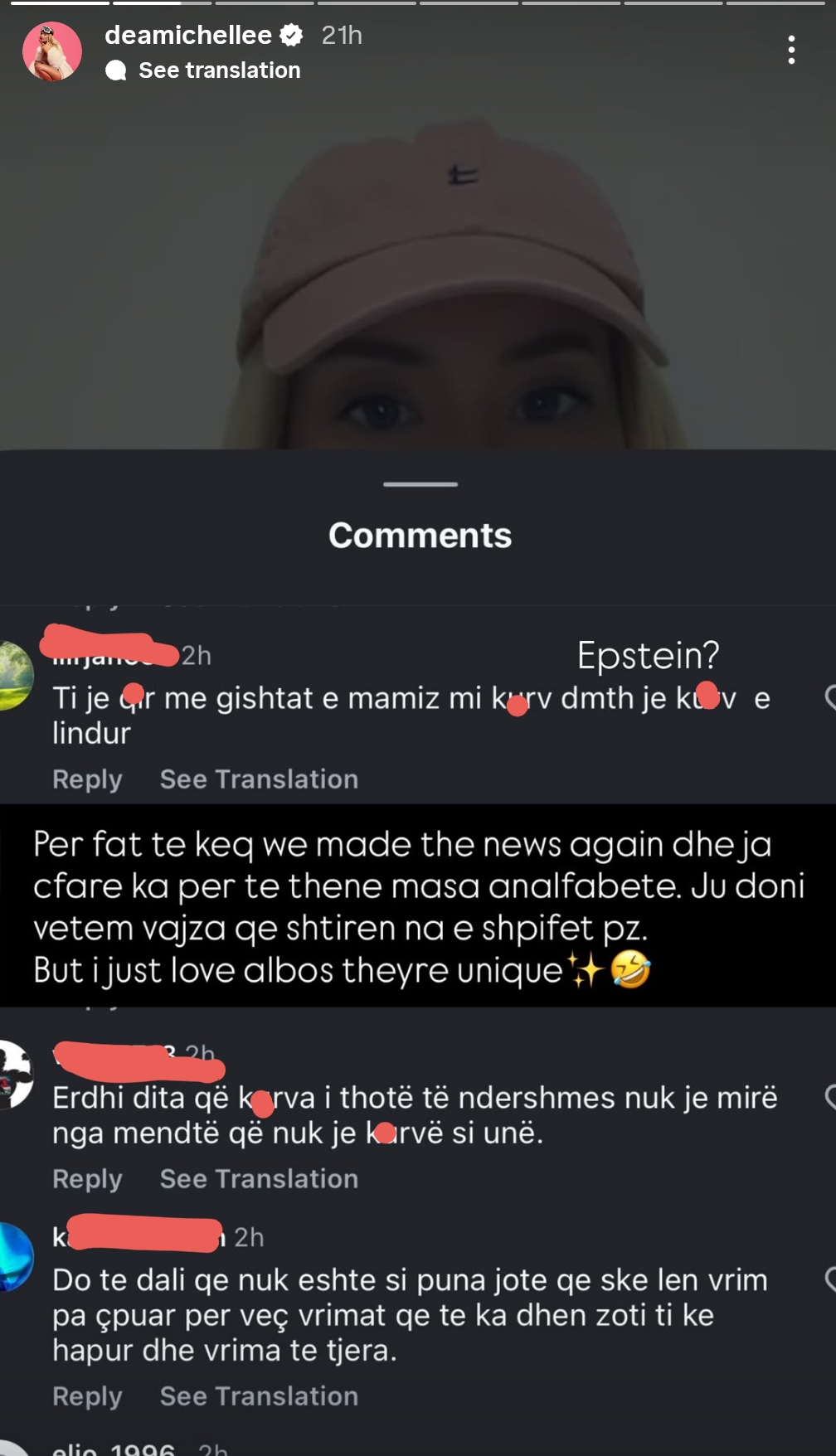 Në një postim në InstaStory, ajo publikoi disa komente tepër ofenduese që kishte marrë në një nga postimet e saj, të cilat përmbanin gjuhë të rëndë dhe sulme personale. Për shkak të përmbajtjes së papërshtatshme, disa nga fjalët janë censuruar.