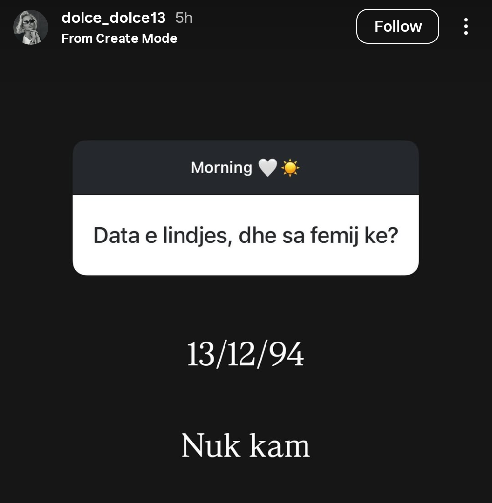 Ajo theu heshtjen duke zbuluar se ka lindur më 13 dhjetor 1994. Për pyetjen e drejtpërdrejtë nëse është nënë, Dolçe u përgjigj shkurt dhe prerë: “Nuk kam”.