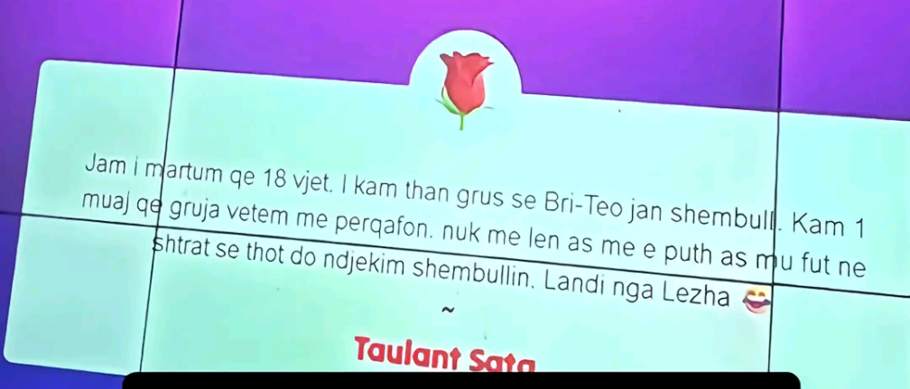 Në ekranin e madh u shfaq mesazhi epik që i shkriu të gjithë së qeshuri:“Jam i martum qe 18 vjet. I kam thënë grus se Bri-Teo jan shembull. Kam 1 muaj që gruja vetëm më përqafon. Nuk më lë as me e puth as mu fut në shtrat se thotë do ndjekim shembullin.”