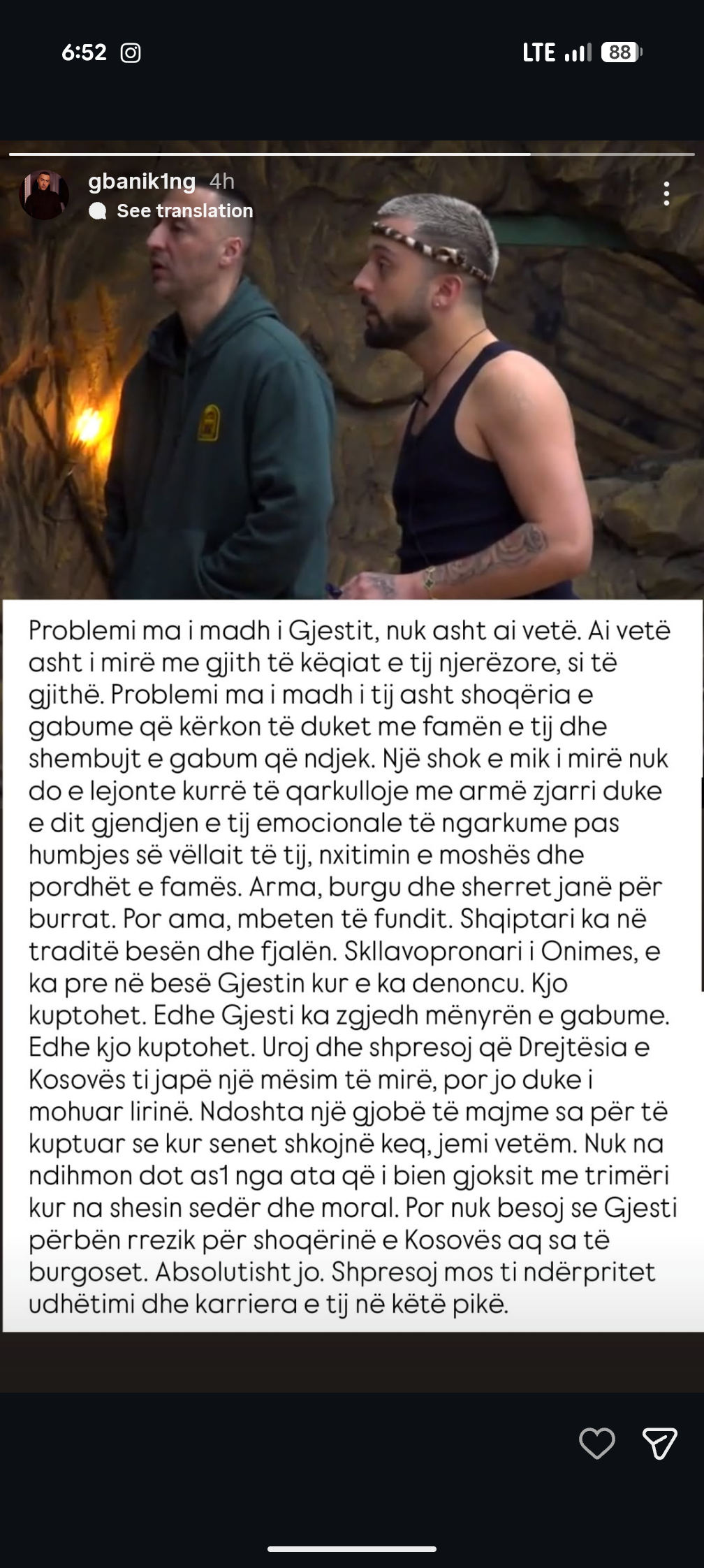 Përmes një postimi të gjatë dhe mjaft të drejtpërdrejtë në Instastory, ai ka bërë një analizë të thellë të situatës, duke fajësuar rrethin shoqëror të Gjestit dhe duke lëshuar terma të rëndë për palën denoncuese.