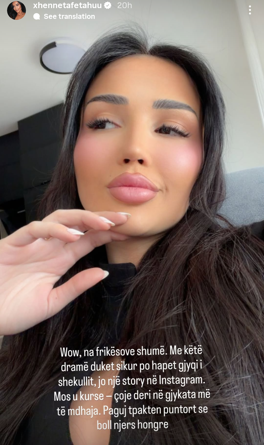 “Wow, na frikësove shumë. Me këtë dramë duket sikur po hapet gjyqi i shekullit, jo një story në Instagram. Mos u kurse – çoje deri në gjykatat më të mëdhaja,” – ka shkruar Xheneta, duke lënë të kuptohet se paditë e tij nuk kanë asnjë peshë për të.