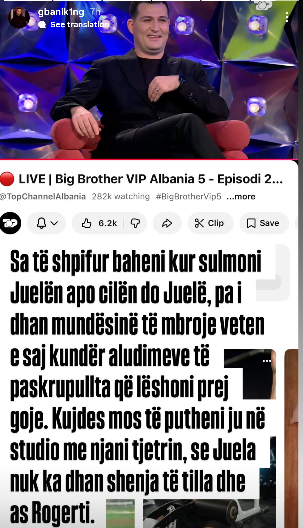 Përmes një postimi në Instastory, ku ka publikuar një foto të opinionistit Arbër Hajdari gjatë transmetimit “Live”, G Bani i ka dalë në mbrojtje Juelës duke akuzuar studion për sulme të padrejta.
