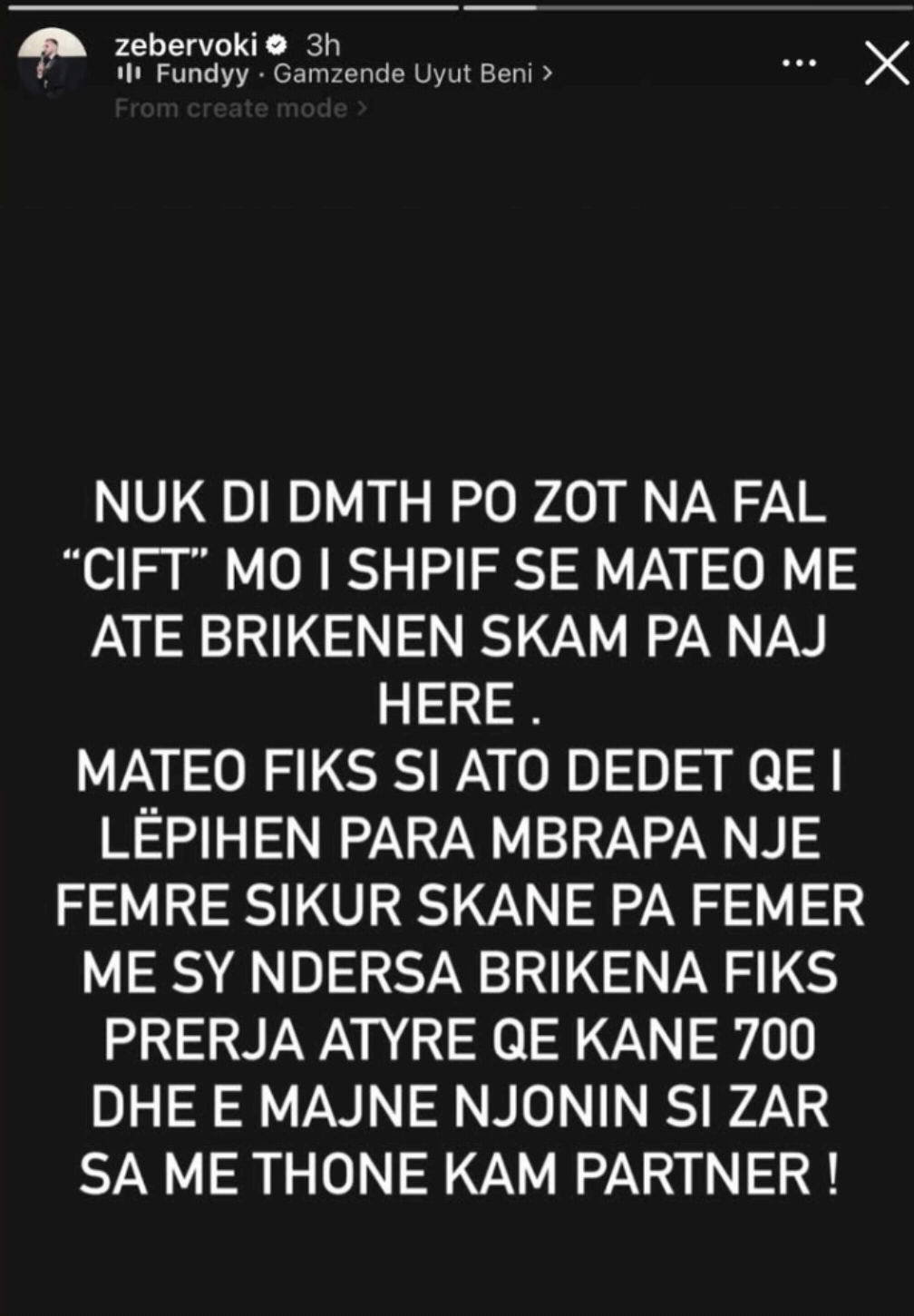 “Nuk di domethënë po Zot na fal ‘çift’ më i shpifur se Mateo me atë Brikenën s’kam parë ndonjëherë. Mateo fiks si ato dedet që i lëpihen para mbrapa një femre sikur s’kanë parë femër me sy ndërsa Brikena fiks prerja atyre që kanë 700 dhe e mbajnë njërin si zar sa me thënë kam partner!”