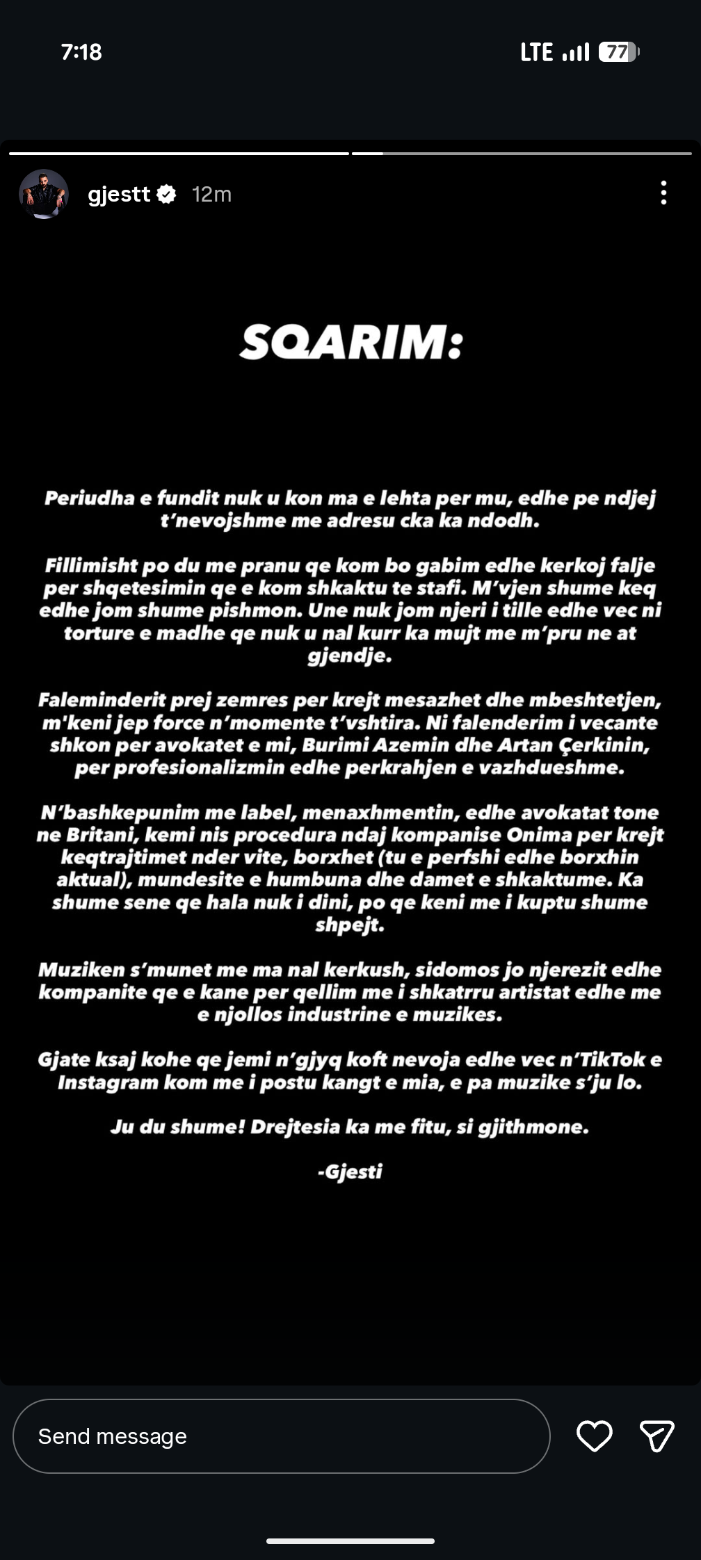 “Muzikën s’munet me ma nal kërkush, sidomos jo njerëzit edhe kompanitë që e kanë për qëllim me i shkatrru artistat edhe me e njollos industrinë e muzikës.”