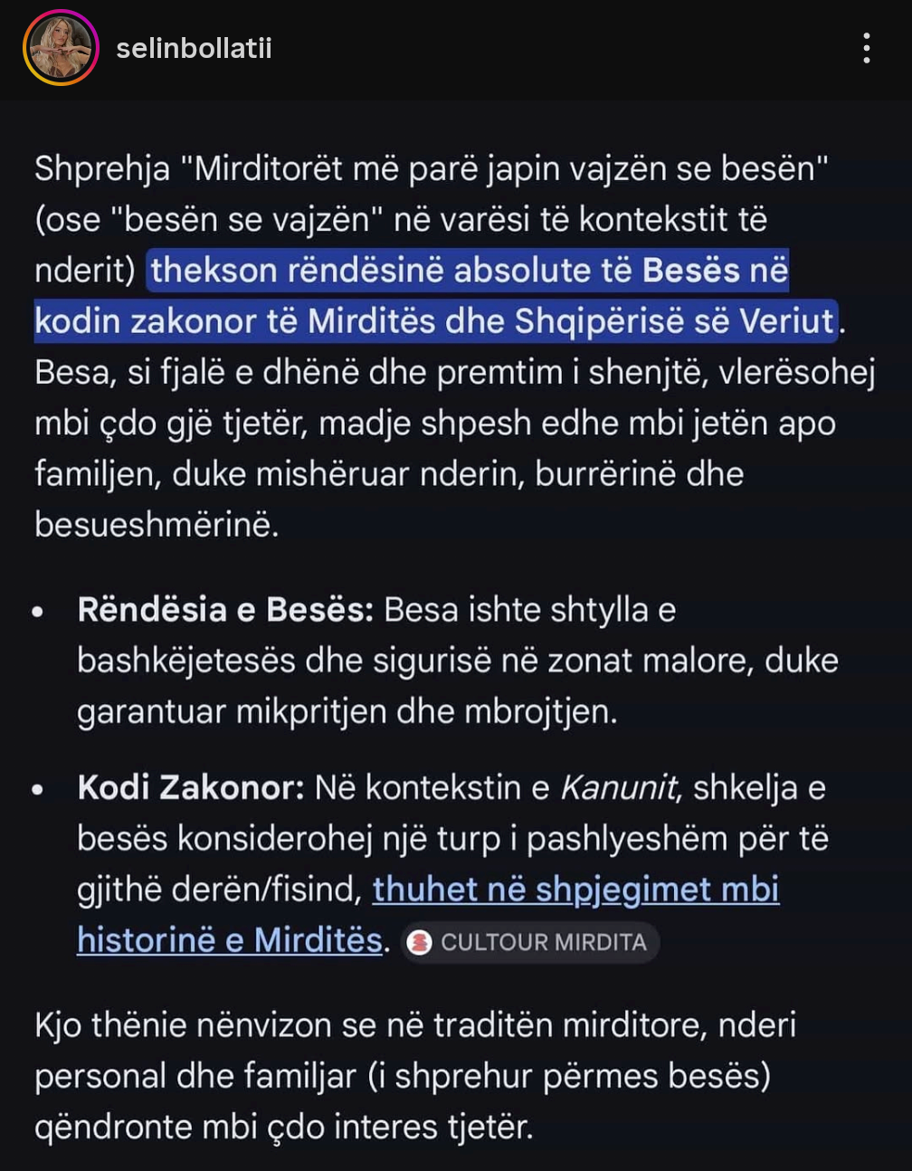 “Shprehja ‘Mirditorët më parë japin vajzën se besën’ (ose ‘besën se vajzën’ në varësi të kontekstit të nderit) thekson rëndësinë absolute të Besës në kodin zakonor të Mirditës dhe Shqipërisë së Veriut. Besa, si fjalë e dhënë dhe premtim i shenjtë, vlerësohej mbi çdo gjë tjetër, madje shpesh edhe mbi jetën apo familjen, duke mishëruar nderin, burrërinë dhe besueshmërinë.”