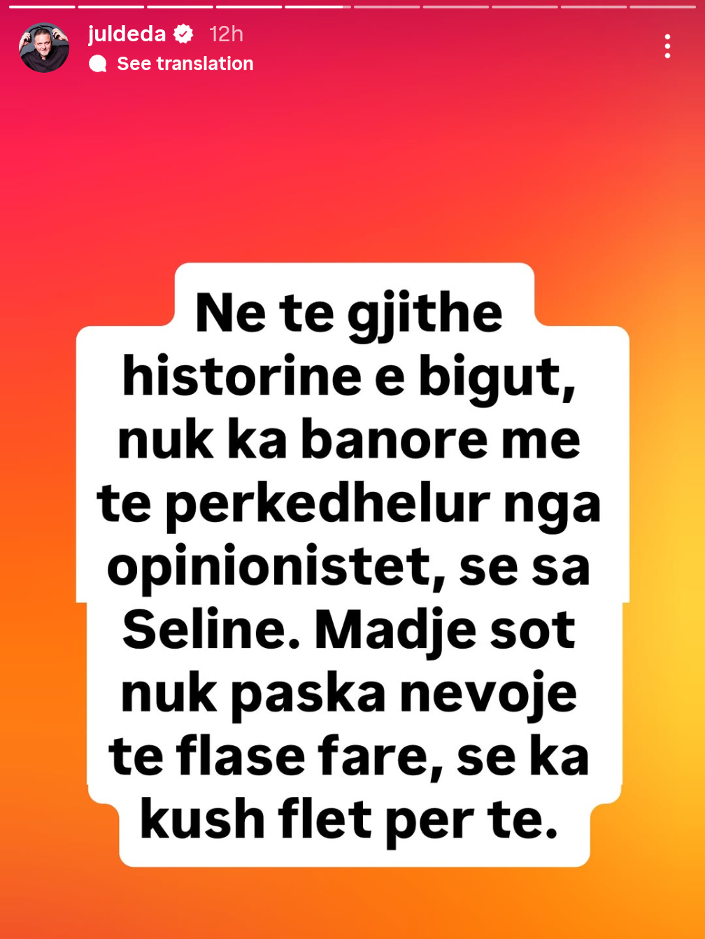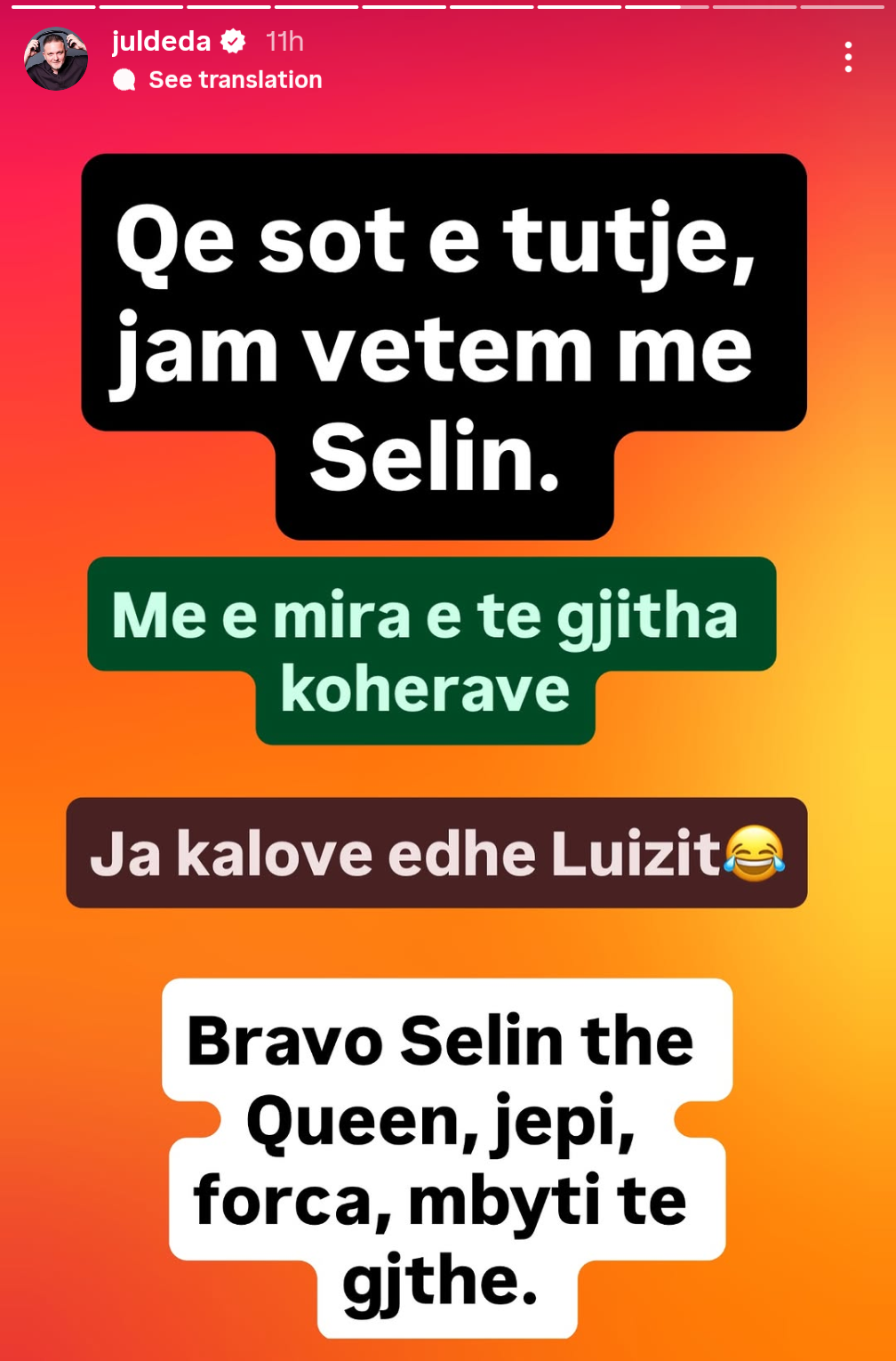 Në fund, ai vazhdon të mbajë të njëjtin qëndrim thumbues duke e mbyllur me fjalët: “Bravo Selin the Queen, jepi, forca, mbyti të gjithë,” një mesazh që qartazi reflekton pakënaqësinë e tij me drejtimin që ka marrë loja dhe mbështetjen e dukshme ndaj banores në fjalë.
