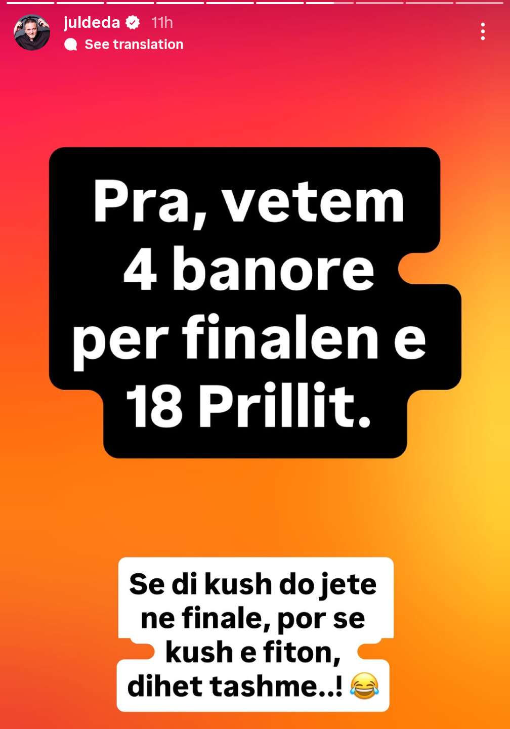 Teksa i referohet numrit të finalistëve, ai shkruan me të qeshur dhe nota dyshimi: “Pra, vetëm 4 banorë për finalen e 18 Prillit. Se di kush do jetë në finale, por se kush e fiton, dihet tashmë..!”.