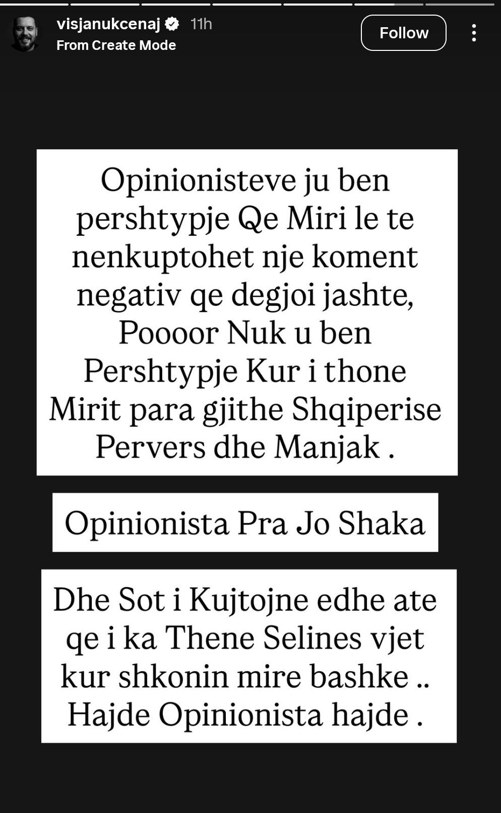 “Dhe sot i kujtojnë edhe atë që i ka thënë Selinës vjet kur shkonin mirë bashkë.. Hajde opinionista hajde,” përfundon ai postimin e tij në Instastory.