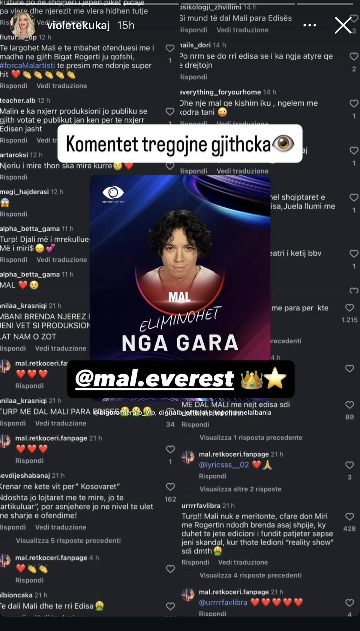 Pas eliminimit të Malit nga “Big Brother VIP Albania”, nëna e tij, këngëtarja Violetë Kukaj, ka reaguar në llogarinë e saj në Instagram.