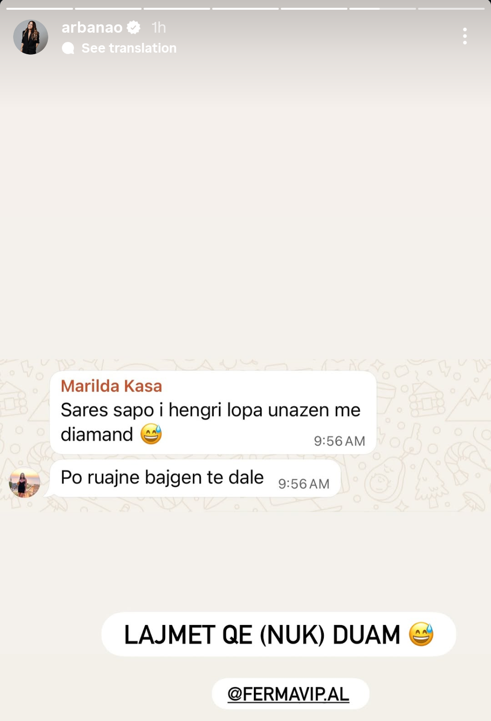 Arbana ka ndarë me ndjekësit në InstaStory një bisedë në WhatsApp.