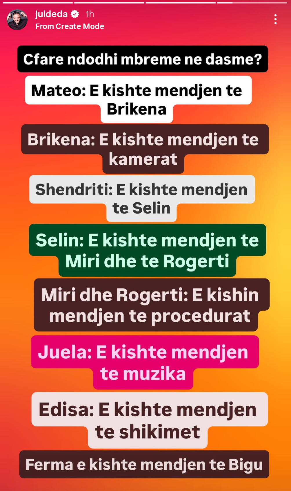 Në një nga postimet e tij të fundit në InstaStory, aktori ka bërë një rezyme me humor dhe ironi të dasmës së Mateos dhe Brikenës, duke shkruar se ku e kishte mendjen secili prej pjesëmarrësve.