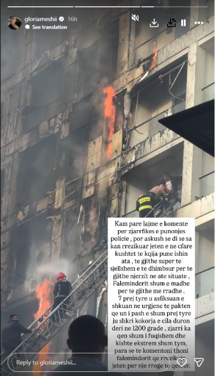 Në një reagim të dytë, ish-banorja e pallatit vlerësoi punën e zjarrfikësve dhe policisë, duke theksuar rrezikun ekstrem me të cilin u përballën gjatë ndërhyrjes.