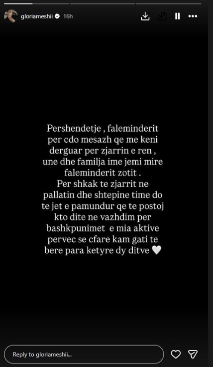 “Përshëndetje, faleminderit për çdo mesazh që më keni dërguar për zjarrin e rënë. Unë dhe familja ime jemi mirë, faleminderit Zotit. Për shkak të zjarrit në pallatin dhe shtëpinë time, do të jetë e pamundur që të postoj këto ditë në vazhdim për bashkëpunimet e mia aktive, përveç se çfarë kam gati të bërë para këtyre dy ditëve”,shprehet ajo.