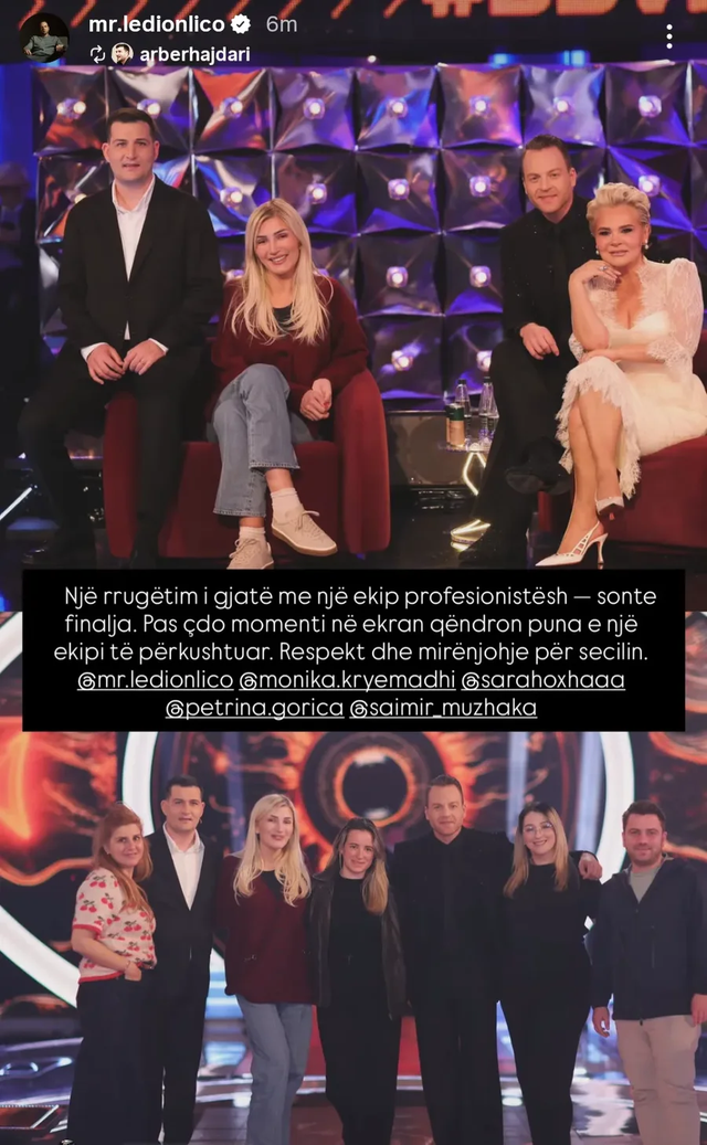 Ai ka ndarë një foto nga prapaskenat e finales së madhe (e ripostuar më pas edhe nga vetë Ledioni), ku shfaqet ekipi drejtues: Arbëri, Monika Kryemadhi, anëtarë të stafit, dhe padyshim, Sara me Ledionin.