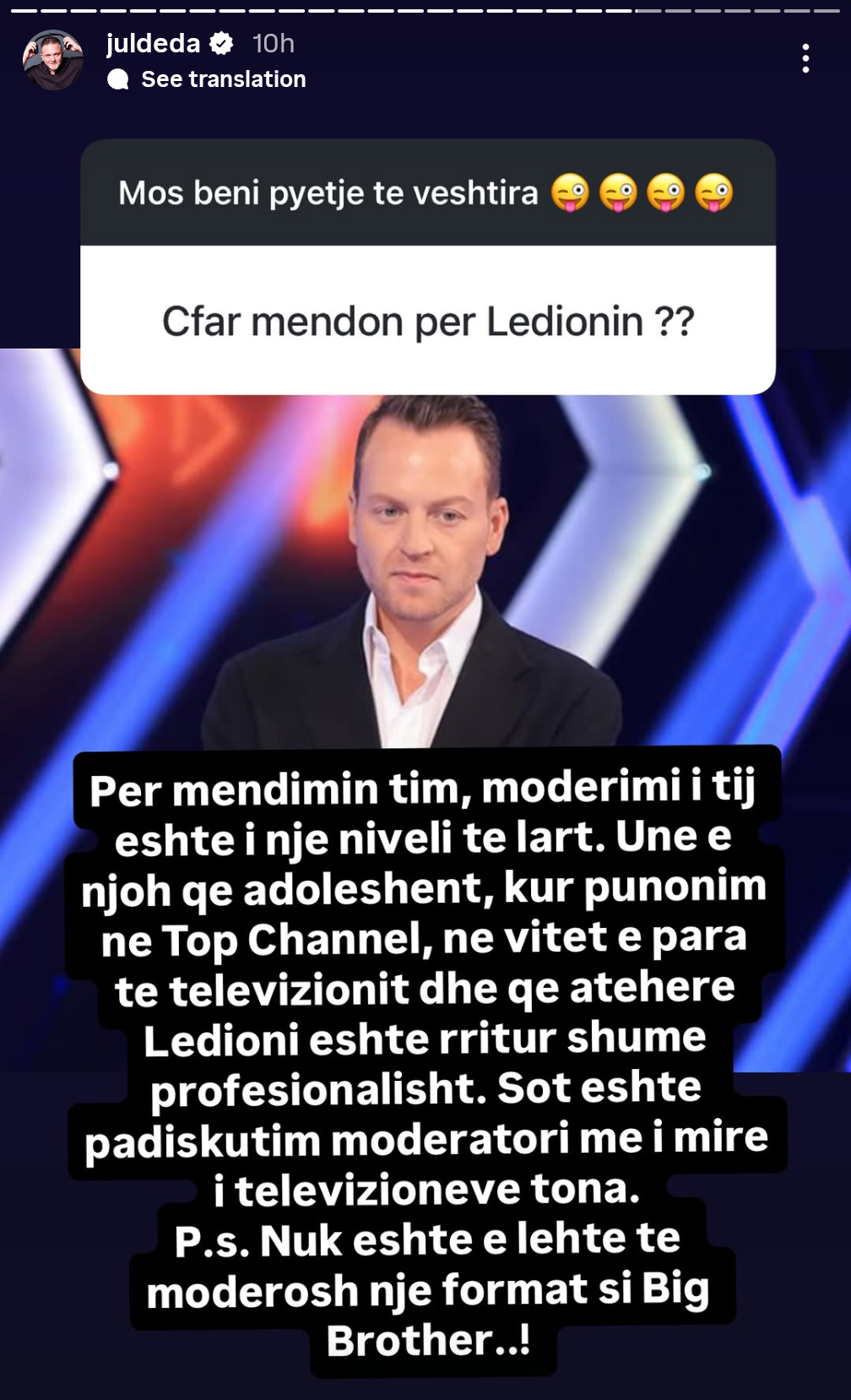 Gjatë një bashkëbisedimi virtual me ndjekësit në Instagram, dikush e ka pyetur Julin se çfarë mendon për Ledionin.